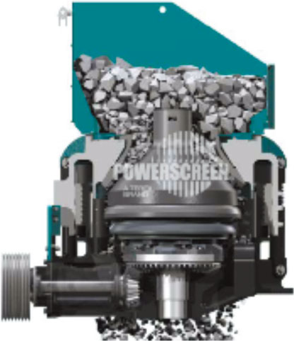- 破砕室にある円錐状のマントルは偏心軸により回転しコンケーブの隙間が変化します。この機構により投入された岩石をすり潰すように粉砕します。