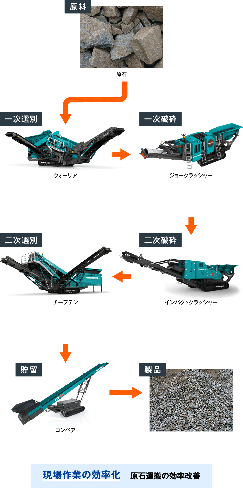 砕石場での環境機器活用 機動力の高い自走式機器は、常に原石山に一番近い場所で作業を行います。作業の効率化だけでなく、省力化も同時に実現するのが自走式機器を組み合わせた簡易モバイルプラントです。 HOME 環境機器事業部 砕石場での環境機器活用 事例紹介 砕石場での自走式モバイルプラント 原石採取場・砕石場での作業改善による生産性向上 商品紹介はこちら 商品紹介はこちら 商品紹介はこちら 商品紹介はこちら 商品紹介はこちら 実例紹介 自走式機器シリーズの実力を実際の現場でご体感ください。 デモンストレーションのご案内 お問い合わせください 《紹介機種の詳細》 ウォーリア チーフテン ジョークラッシャー インパクトクラッシャー コンベア カタログ請求 ウォーリア・チーフテン掲載(カタログNo.1、3) ジョークラッシャー・インパクトクラッシャー掲載(カタログNo.1、6) コンベア掲載(カタログNo.1、4)