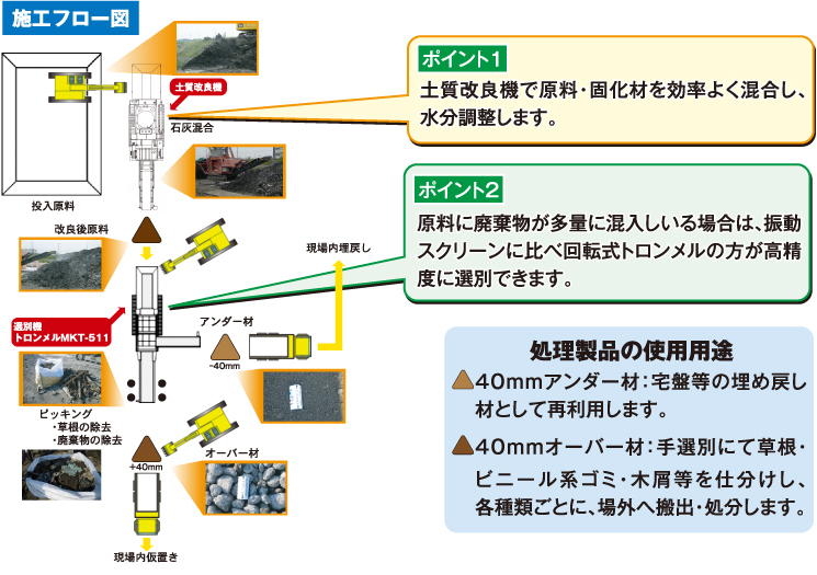 土質改良機と選別機を組み合わせて、あたかも簡易プラントのように作業を進めていきます。移動式の機械であれば、設置工事も不要、また、作業の進捗状況に合わせて一番効率的な場所へ移動・設置することができます。
